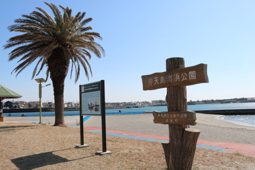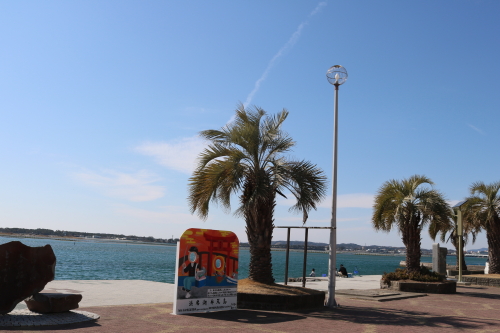 JR駅からすぐの場所です。晴れた日とはいえ、風が強く寒かったです。ヤシの木が植えられています。景観はよいと思います。