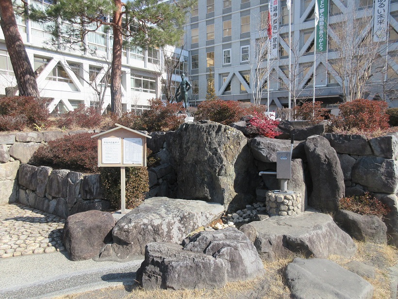 松本の城下町は、至るところで綺麗な湧水があります。行政の中心である松本市役所庁舎のすぐ前にも井戸があって、こちらも飲料水として問題ないとの説明書きがありました。ただ、石でできた小庭園の一部のようになっていて、手汲みポンプまで少し離れていたので利用は遠慮しました。