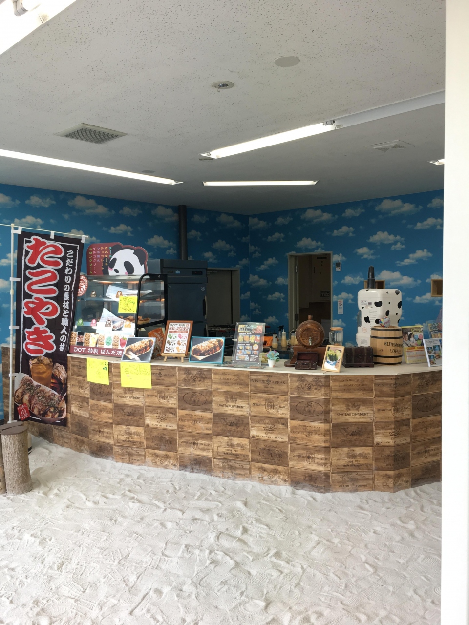 店内は南国をイメージしているのか、砂が敷かれています。メインはメロンかき氷でしたが、たこ焼きなども売られており、統一感はなかったかな(笑)スモールサイズは、半玉でなくカットメロンにかき氷がのっているタイプなので沢山通常サイズをオーダーしましょう。