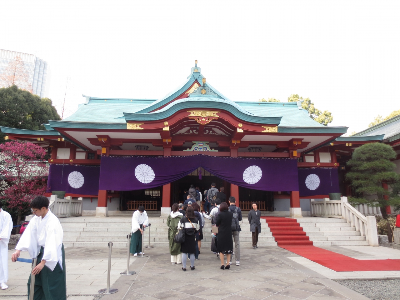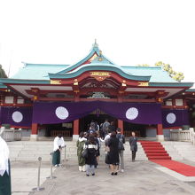 永田町の休日は閑散としていますが、神社は賑わっています。外国人向けの看板が至る所に設置されておりマナーの指導に苦慮しているようです。社殿後ろには鎮守の森も神奈備山もなくビルがそびえ立っているのが都会の神社らしいです。手水舎の横には入場無料の宝物館があります。