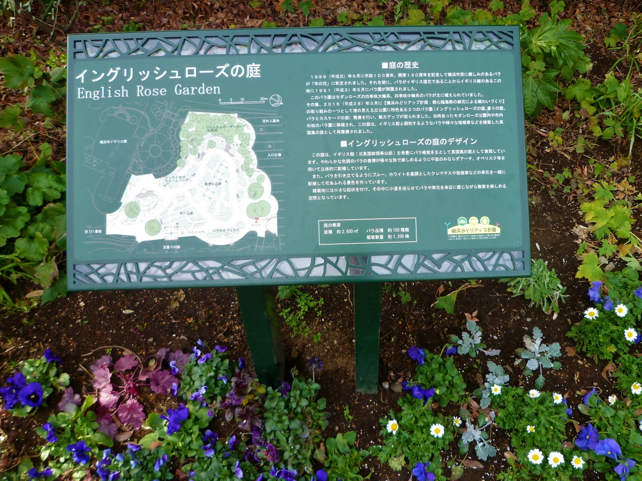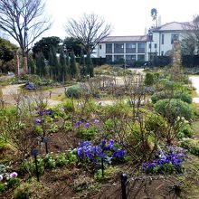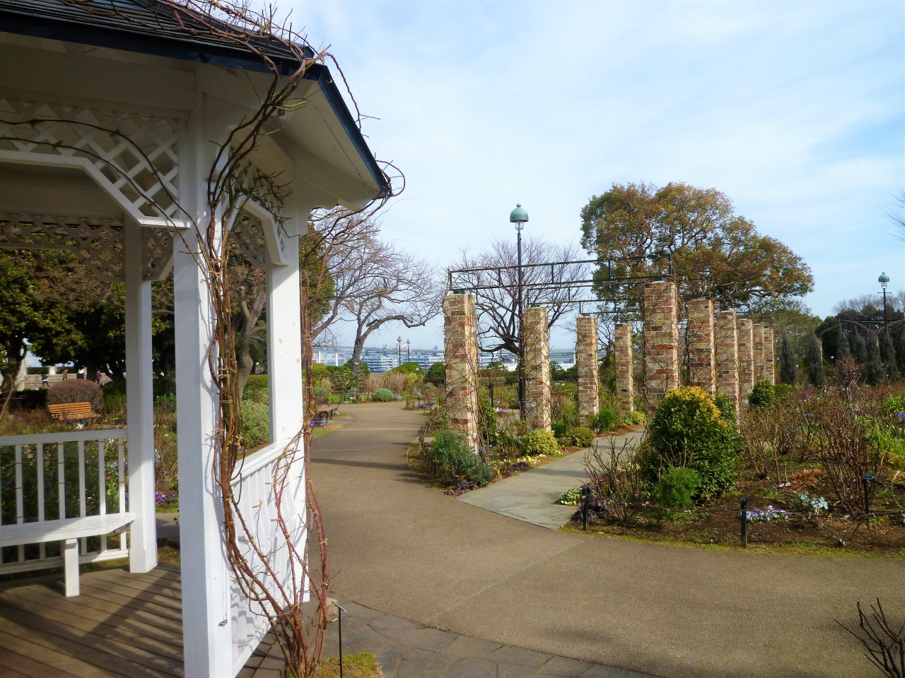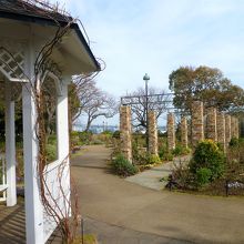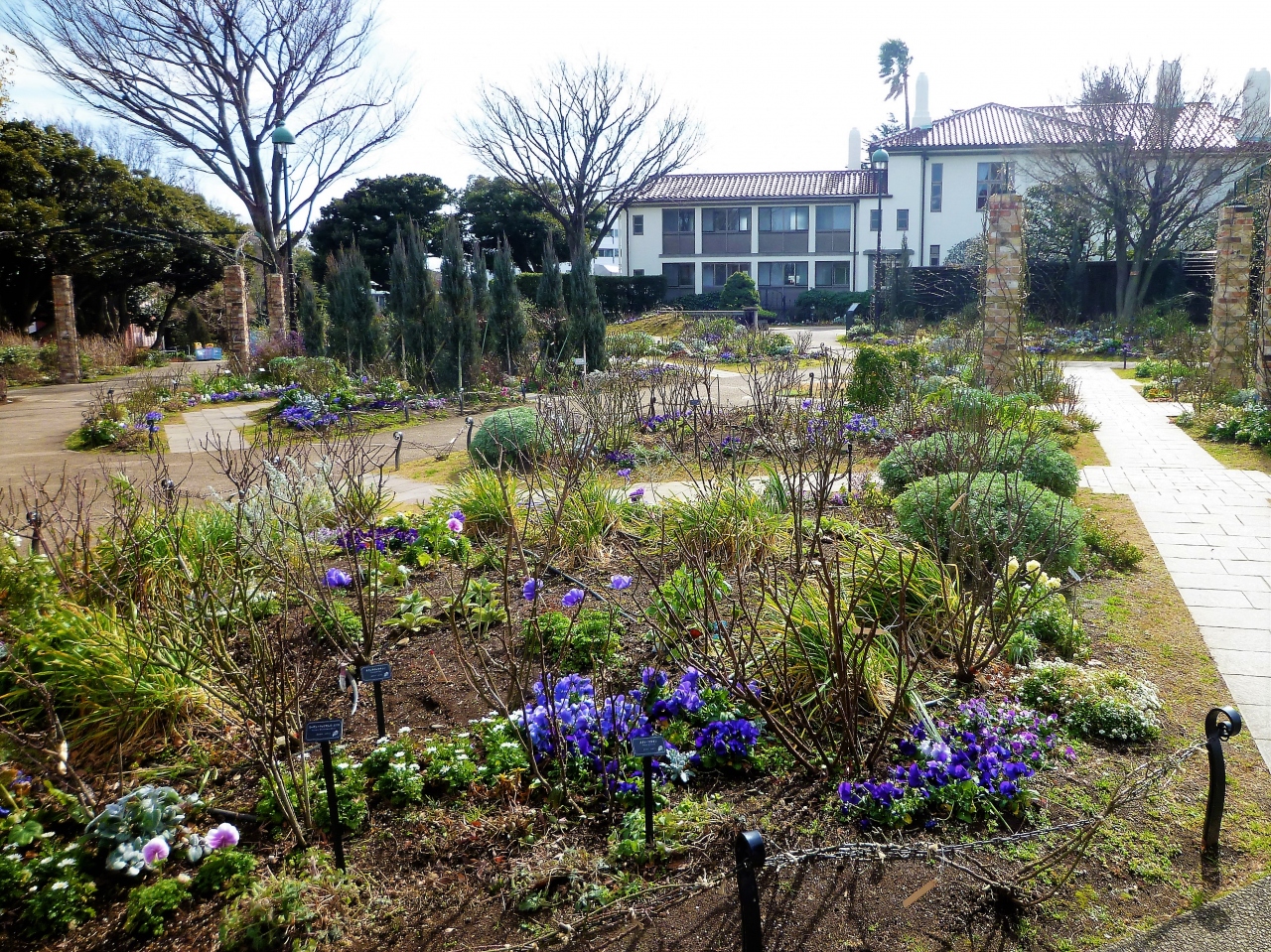 港の見える丘公園のイギリス地区に`横浜市イギリス館`の中庭に(湾にベイブリッジが!)[ローズガーデン]があります/ローズは一般的なので(?)`イングリッシュローズ`で<イングリッシュローズの庭>ですね♪ 2月なのでバラは未だでしたが…きっと石柱と梁のトンネルにバラが咲いているのですね…パンジーが飾っていました。