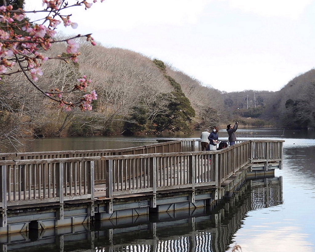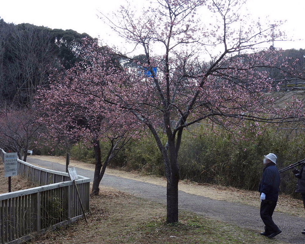 水郷県民の森でバードウォッチングを楽しんだ時、大膳池の畔に植えられた河津桜がきれいに咲いていました。