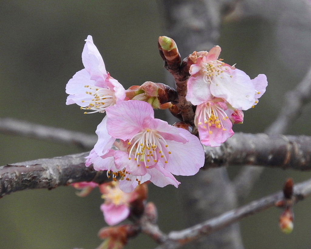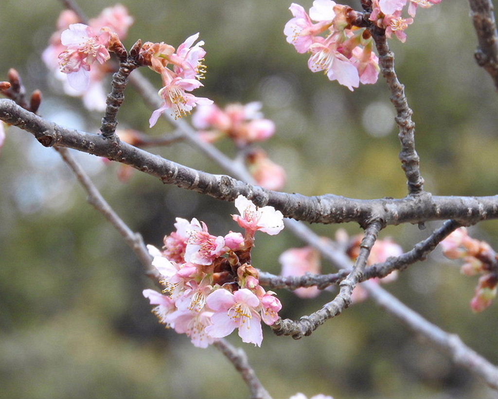河津桜は、オオシマザクラとカンヒザクラの自然交雑種であると推定され、1月下旬から2月にかけて開花する早咲き桜だそうです。