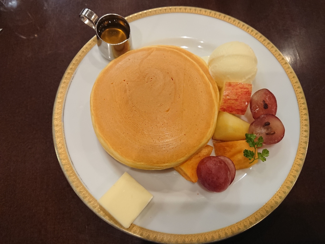 じっくり焼き上げたホットケーキは綺麗な焼き目が付いていて美味しそうですが、じっくり焼き上げた分、水分が飛んでしまうのか、ちょっとパサついてしまうのが残念です。