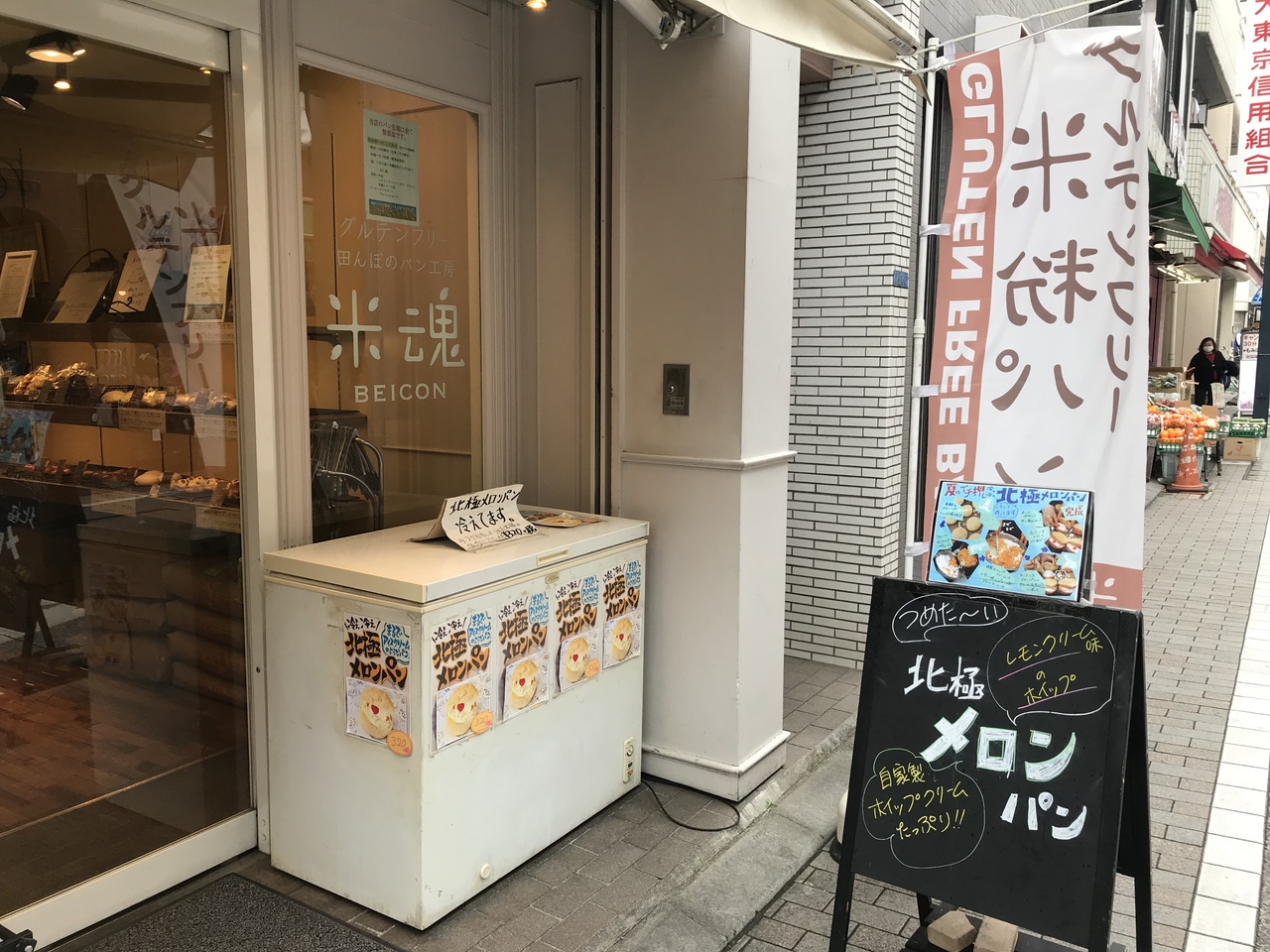 店の前に、「冷たい北極メロンパン、レモンホイップクリーム入り」がケースに入ってました。