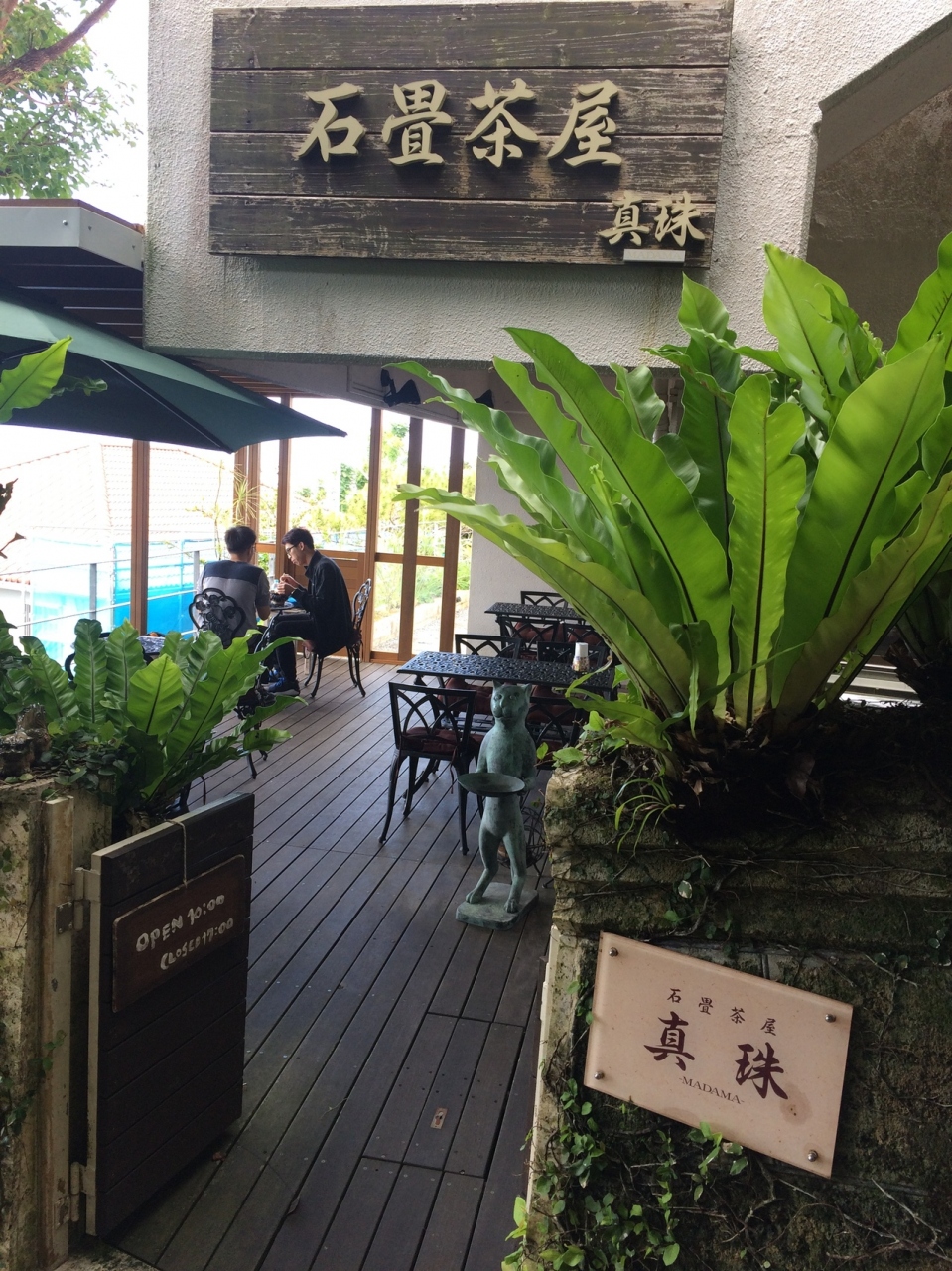 喫茶店です。急な坂の途中にあるので、タクシーなどでは行けません。石がごつごつしているので、バリアフリーは厳しいと思います。テラス席から、那覇市全体が見えます。石畳と同じで、石を多用した空間で、とてもほっとします。
