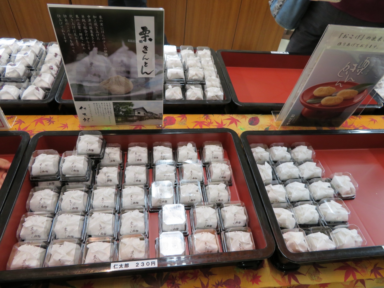 駅に近い特産館です。このあたりは栗きんとんで有名なのですが、どこのお店がいいか迷う場合におすすめです。すべてのお店のものというわけではありませんが、かなりのお店のものを取りそろえていて、1個ずつ購入することができます。ただし季節限定の可能性もあるので事前に確認したほうがよいです。