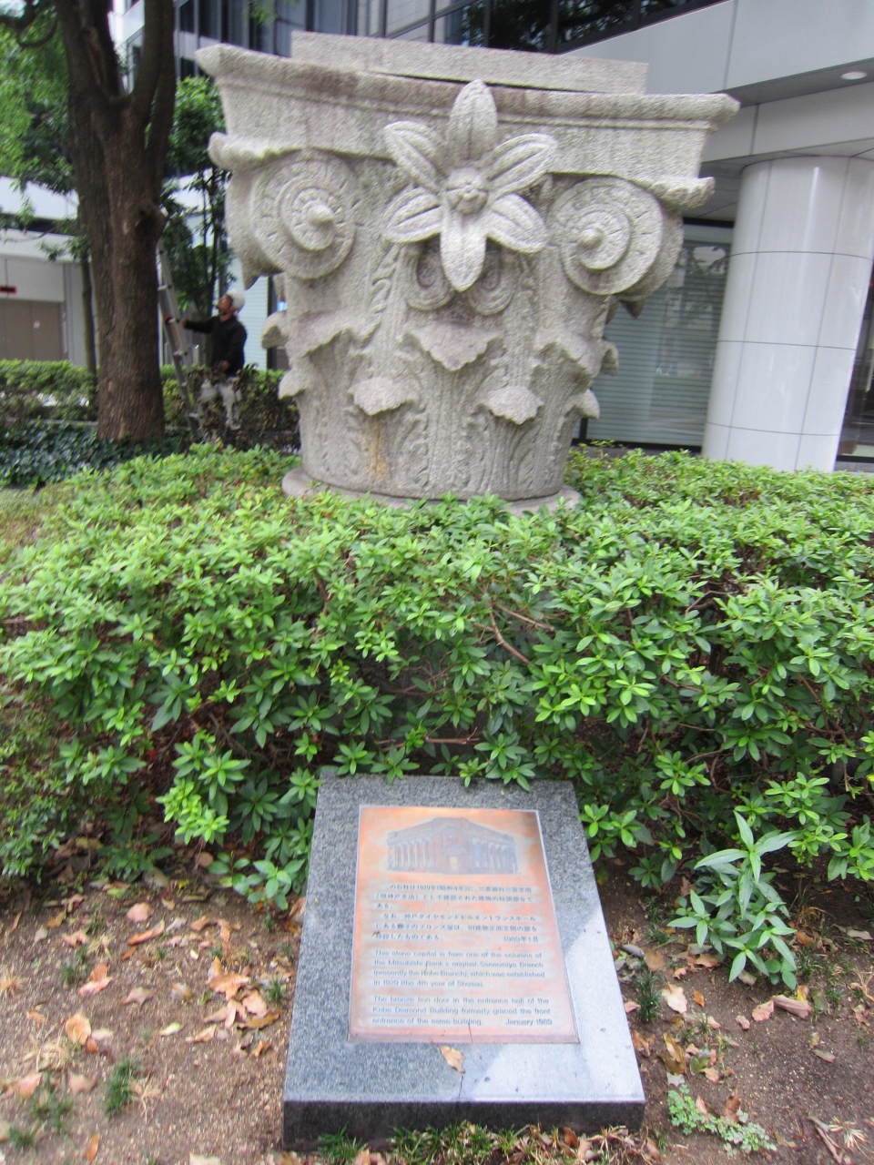 2016年に解体された旧三菱銀行三ノ宮支店の石柱の上にあったものだそうです。緑の花壇の中にありました。説明の看板もありました。彫刻が個性的で、花びらの模様です。目と花と口のようにも見えて、思わずじぃっと見つめてしまいました。