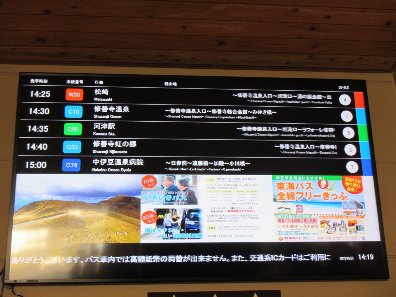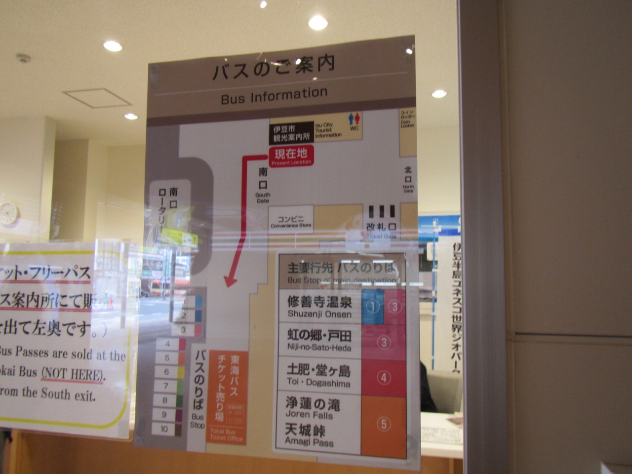 修善寺までは、駅から少し出たところのバス乗り場、1又は3番乗り場から修善寺温泉行きに乗り、終点下車(約10分・¥220円)です。