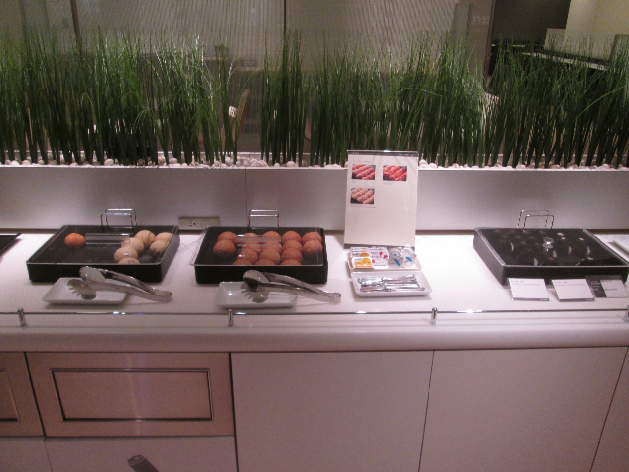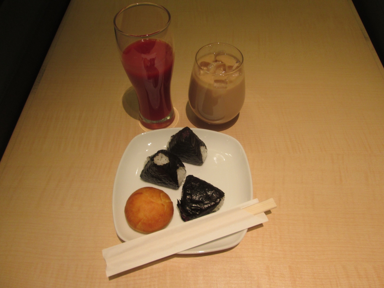 ラウンジ内の食事メニューにあるおにぎりは具を定期的に変更してくれます。梅・鮭の日と牛しぐれ・野沢菜の日の2パターンになっているようです。また、出汁の効いた温かい味噌汁もつねに用意されており、午後遅い時間帯のときは夕食のように利用できました。
