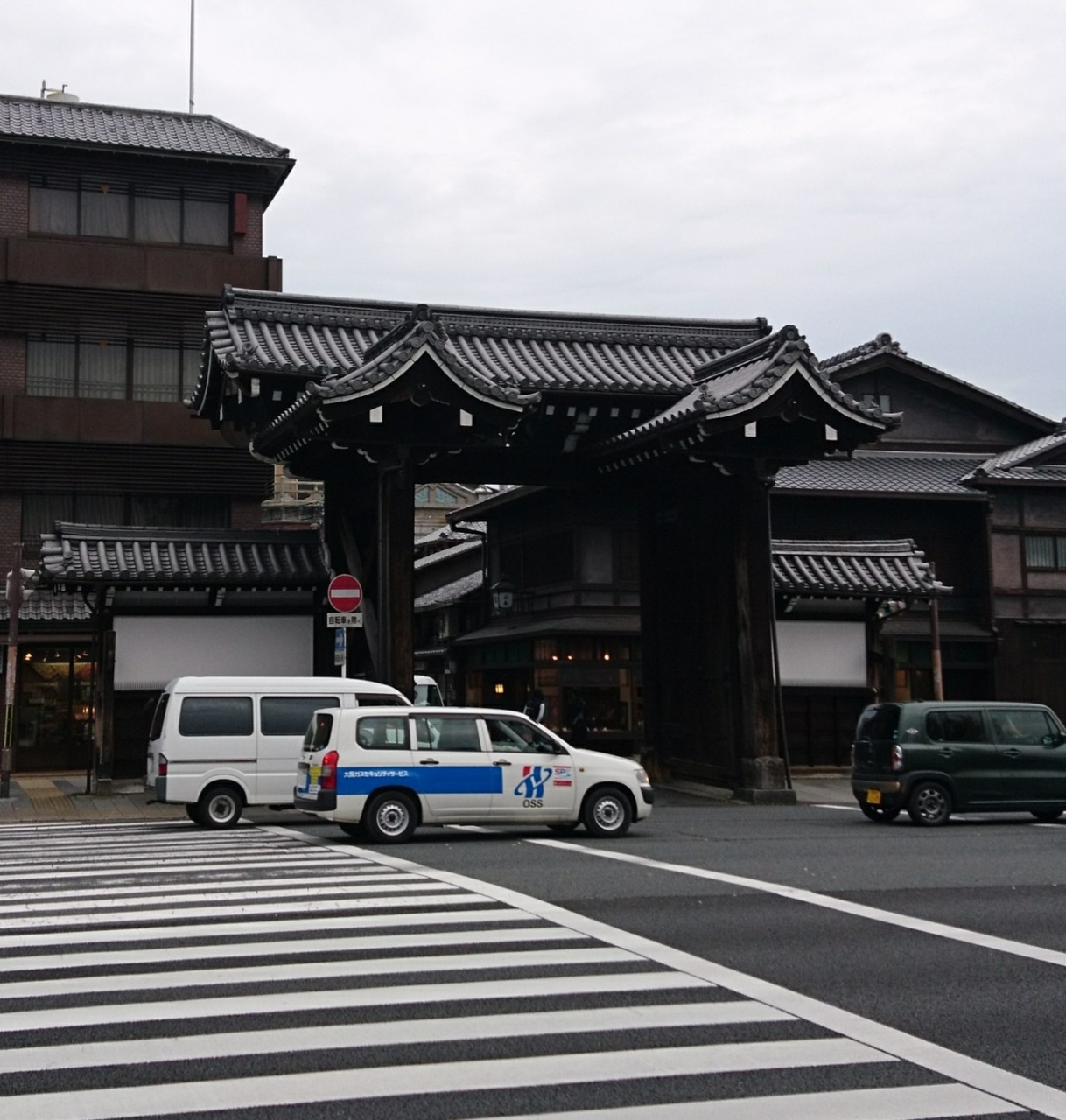 西本願寺は総門で二重に塀が仕切られていたのかと思いましたがそうではなく昔の写真をみてもこの門はポツンと建っていました。高麗門の造りでいつも門が空いていて車が多く通過しています。