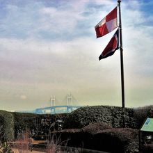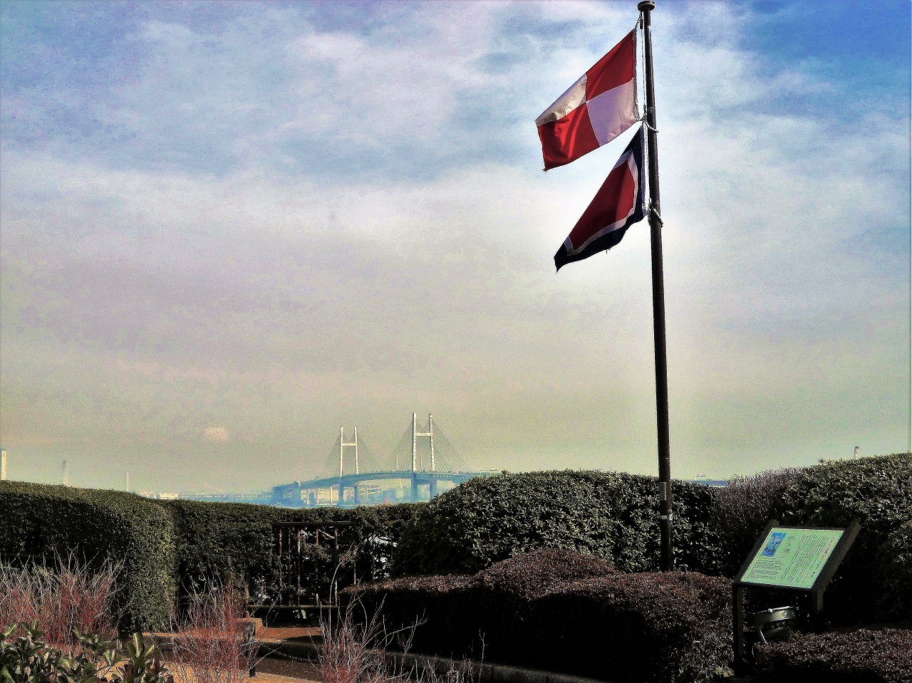 港の見える丘公園・展望広場の一角には記念スポット[コクリコ坂から]が! UWの国際信号旗;安航を祈る-I wish you a pleasant voyage-;と展示がありますし、湾の向こうにはベイブリッジが♪ `コクリコ`はフランス語でヒナゲシ;(フランス山経由で来たので)またフランス語が(^^)/最優先アニメーション受賞/宮崎駿(企画・脚本) & 宮崎吾朗(監督)!