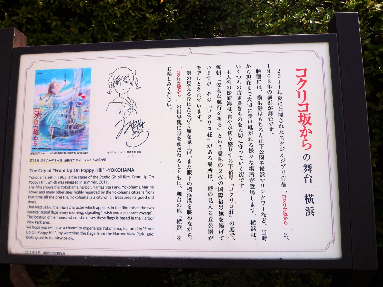 ここで一つ提案が;港の見える丘公園の魅力…①景観;展望台から山下公園/大さん橋/みなとみらい方面とベイブリッジを眺望 ②由緒ある建屋と庭園;様々な草花/特にバラが咲いていますが有名ですが、プラスして③シーン;今までも映画/TVでも放映されたのですが、`コクリコ坂から`の記念スポットが(^o^)