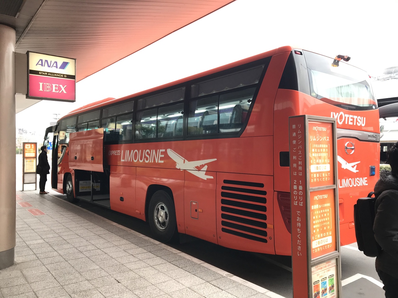 松山空港から松山市内中心部に向かうリムジンバス。鮮やかなオレンジが特徴的です。