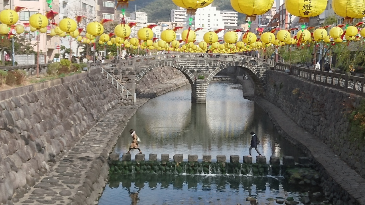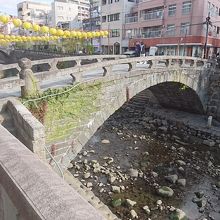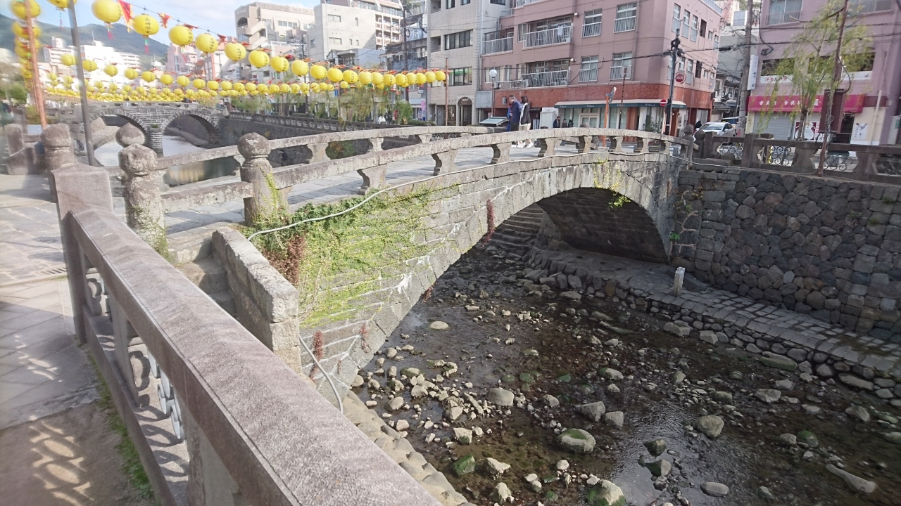 長崎市に旅行したときに眼鏡橋を見に行こうと中島川に行きました。眼鏡橋が美しく見えるポイントとして有名なのが、袋橋から見た眼鏡橋です。そこから見た眼鏡橋は水面に眼鏡橋が映ることで眼鏡にように見えることから、撮影スポットとしても有名な橋です。