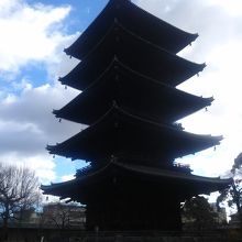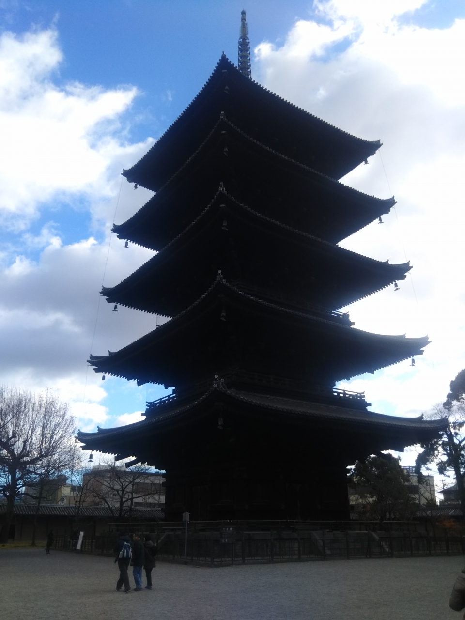 東寺にある五重塔で、新幹線からも見ることができる大きなものです。木造建築物としてはては日本一の高さで55メートルあります。 寺院における塔は釈迦の遺骨である仏舎利を納めるもので、空海が唐から持ち帰ったものが納められています。その立ち姿は力強く、非常に優美なものを見ることができました。