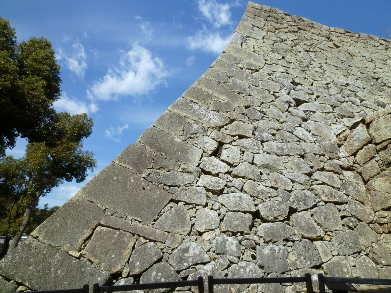 石垣の上に行くほど反りあがる曲線は、扇をひろげた曲線に似ているようで、扇の勾配と呼ばれています。石垣が崩れないように、下の部分は緩く、上の部分は直角に近い角度で崩れないように積んでいます。直方体の石を長短の辺が交差するよう詰まれています。