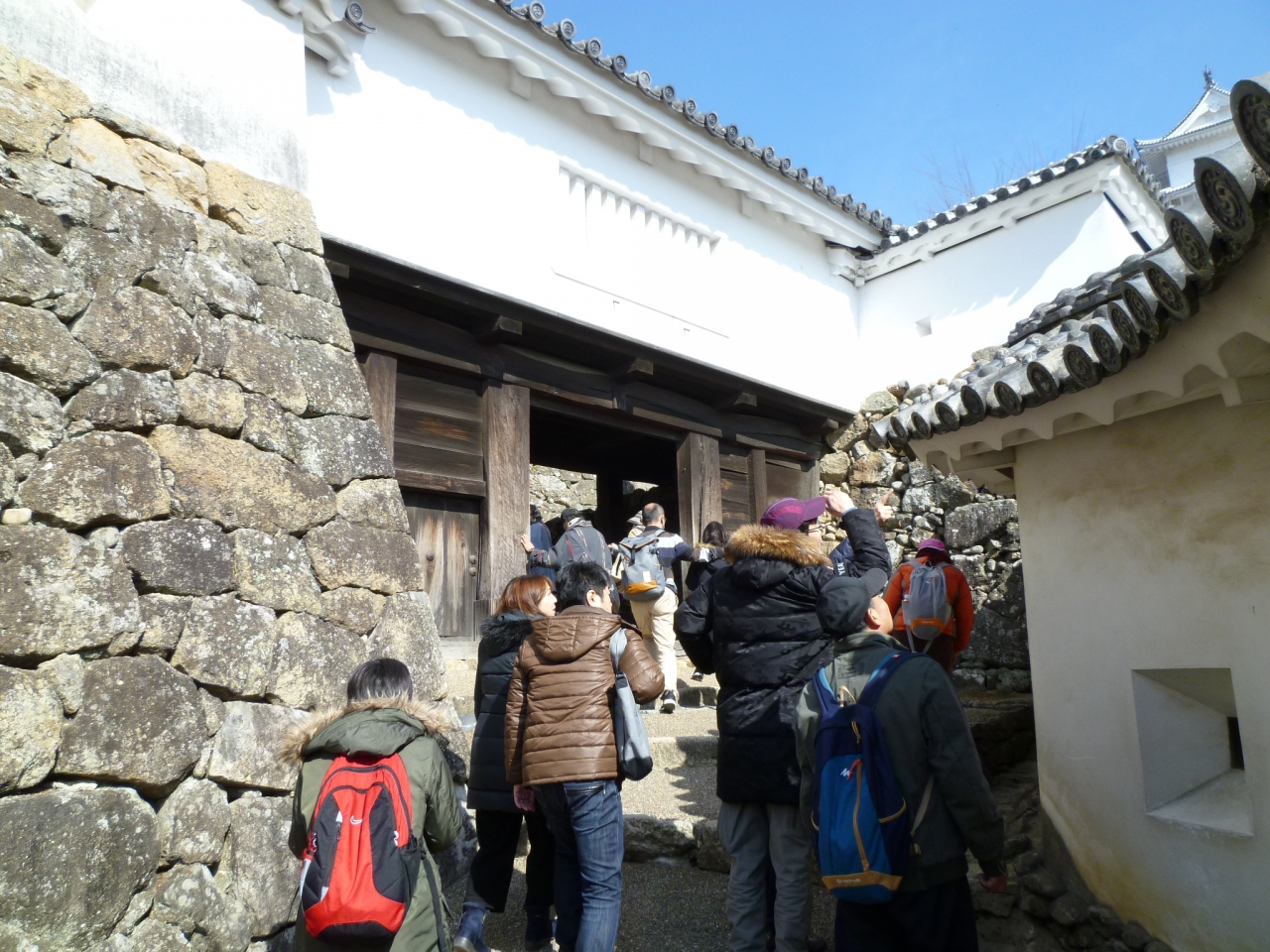 将軍坂を上ると見えてくるのがはノ門です。いノ門やろノ門と違って、格段に防御力がアップした門だそうです。櫓門というスタイルで、門と櫓が合体した最強の出入り口とのことです。この門は、日本の城門の中でも古い方で、秀吉時代の建設されたものを輝政がそのまま使用したらしいです。