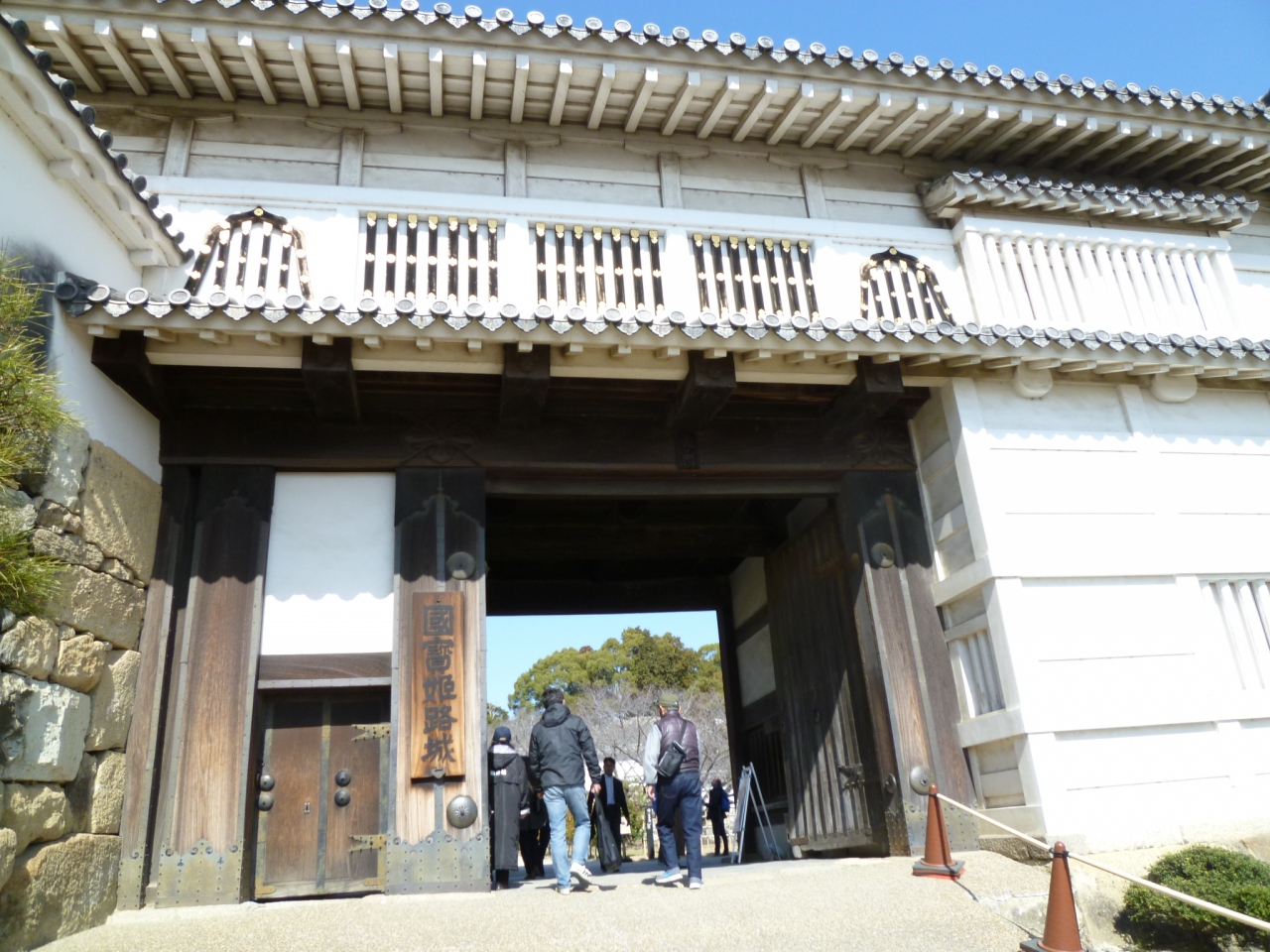 櫓門とも呼ばれる形式で、二の丸の入り口を固めた門です。両柱の上の冠木の木彫りの菱の紋があったことから「菱の門」と呼ばれているそうです。門全体に安土桃山時代の様式を残していて、姫路城の中では一番大きな門だそうです。