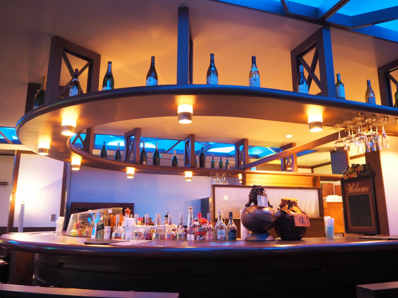 リザンシーパークホテル谷茶ベイの中にあるオシャンティーなバーです。我々はホテルの無料クーポン券を利用して白ワインをいただきました。店内はすべて間接照明でカップルで訪れれば雰囲気が盛り上がること間違いありません。