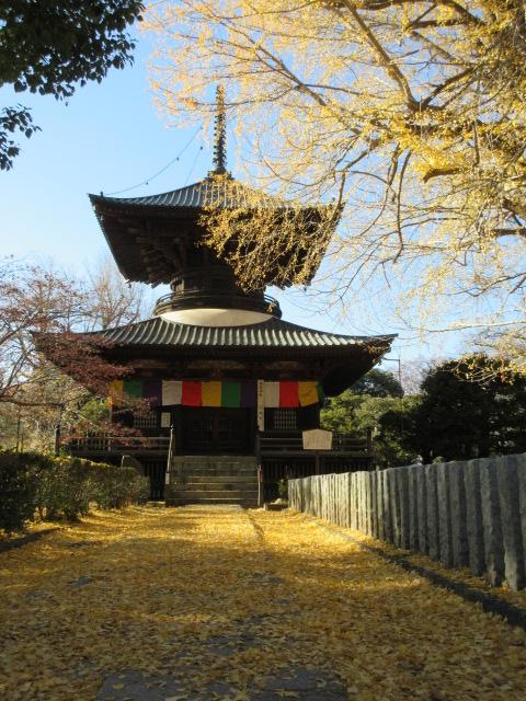 栃木の足利の観光で鑁阿寺を訪問しました。お寺の毛代にある多宝塔は、色鮮やかな布があって目立ちます。江戸時代に建てられたそうですが、白と茶の色合いと、そったような形の屋根が印象的でした。塔の前のイチョウの木が時期もちょうどでとても立派でした。