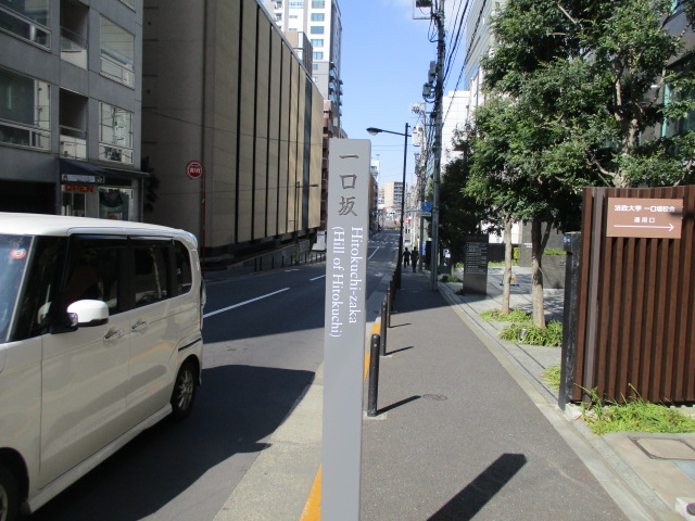 東京メトロ市ヶ谷駅A4出口から靖国通りを靖国神社方面に進み一口坂交差点の左側にある一口坂に歩いて5分ぐらいで着きます。一口坂は(いもあらいさか)とも読むそうで、いもあらいは疱瘡(ほうそう)を洗う(治す)という意味からきているそうです。「靖国神社」の裏にあるので疱瘡を治す社があったのでしょう。現在は面影はなくビルや店舗が立ち並ぶ都会の舗装されたなだらかな坂です。