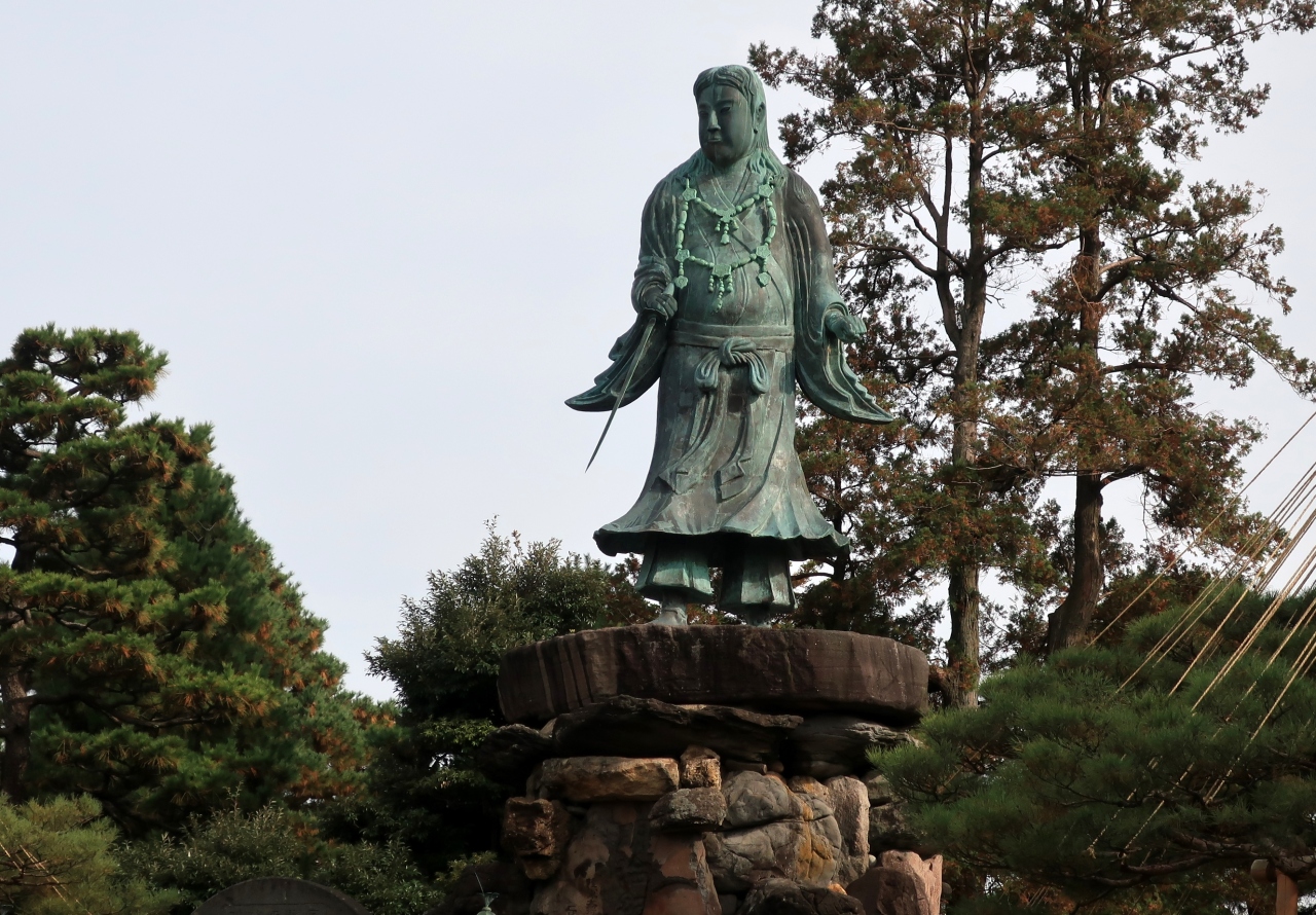 西南戦争で戦死した石川県軍人の慰霊顕彰碑だ。日本武尊が選ばれたのは、熊襲征伐と出征先で亡くなったという神話が西南戦争と共通しているのが理由とされる。1880(明治13)年の建立で、日本最初の銅像として知られる。鳥がとまらないし糞をしないという<都市伝説>が知られるが、大学教授の調査で銅に含まれるヒ素や異種金属が混じっていることで発生する電磁波が原因だという。それはともかく日本武尊は若々しい印象だったが、この像は随分と貫禄がある。