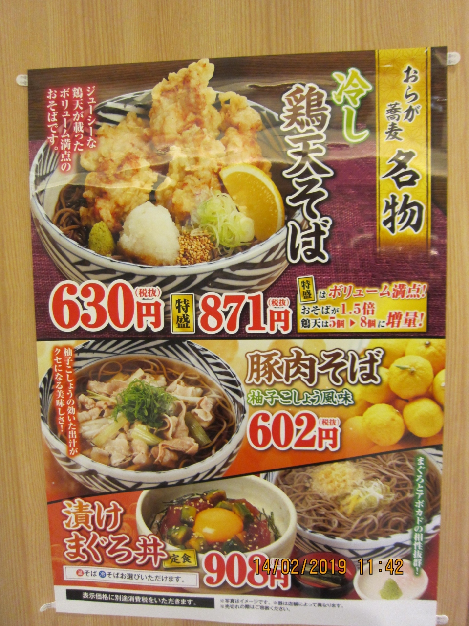 名古屋駅のユニモールにあるお店です。 本格的なお蕎麦がお値打ちにいただけます。 どれもとてもお値打ちな美味しいお蕎麦です。 おらが名物は、冷やし鶏天そばで630円ですが、ボリューム満点の特盛でも871円です。 かき揚げそばもおいしかったです。