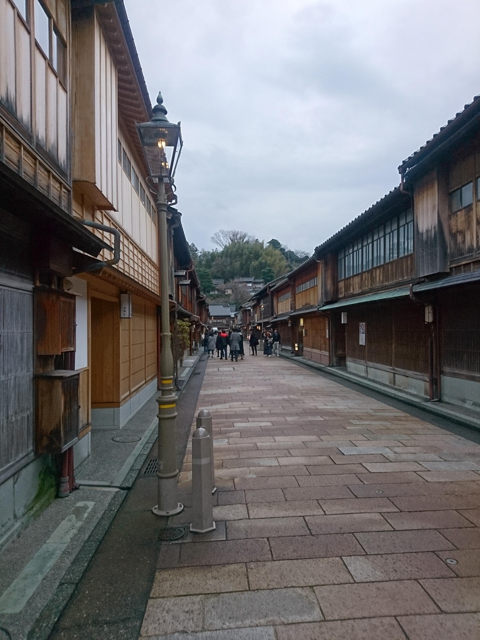 金沢は先の第二次世界大戦で空襲がなかったおかげで、古い町並みがそのまま残っているところが多い。特にこの茶屋街の風景は歴史的景観として、金沢観光の目玉的存在である。建造物の一部は今も現役の民宿や料亭などで使われている。
