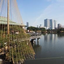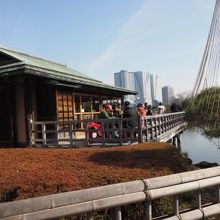 浜離宮の潮入りの池に浮かぶ中島の御茶屋では抹茶を楽しむことができます