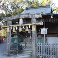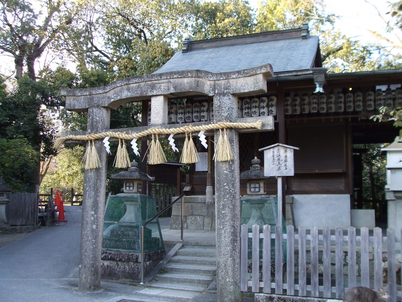 京都御苑内にある3つの神社の一つで、南側の堺町御門や間ノ町口から入ってすぐのところ、九条池に浮かぶ中島にあります。こちらの鳥居は笠木と島木が唐破風なので唐破風鳥居といわれ、京都三珍鳥居の一つとされています。