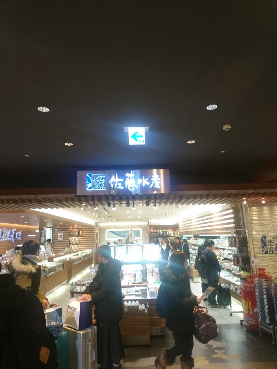 新千歳空港ターミナルビル内のショッピングゾーンには海産物店が多数あり、北海道を離れる直前でも地元海産物をお土産に買い求めることができる。この佐藤水産は地元の大手水産加工業者で、取り扱う水産品の種類が多い。