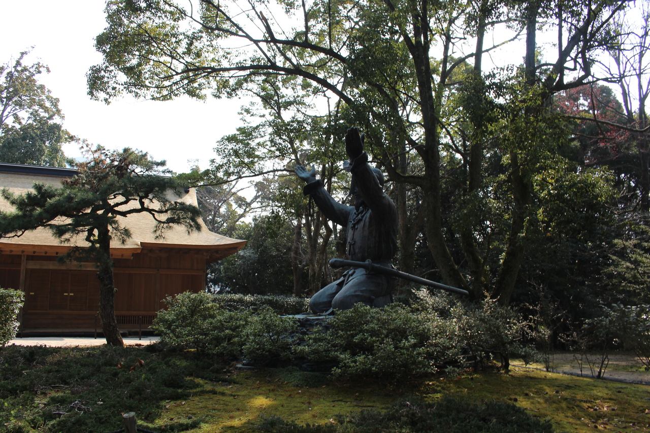 島根県の人気観光スポット、出雲大社の敷地のなかにある必見スポットです。敷地内にはいくつか神話に基づいた一場面を再現した銅像がたっています。そのなかでもここは大国主大神が両手を挙げて、海の神から幸魂奇魂を受け取っているシーンです。荘厳なシーンで迫力を感じました