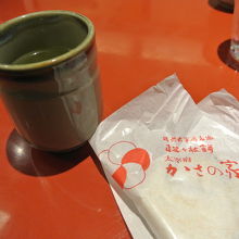 食べ歩き用に梅ヶ枝餅を買ったのですが、お店の方が店内でも食べられますよと案内してくださり、外が寒かったこともあり店内で頂きました。温かいお茶も出して下さいました。出来たての梅ヶ枝餅はアツアツで皮が柔らかくてとても美味しかったです。