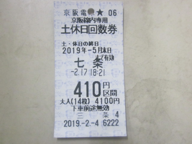 大阪と京都とを結ぶ路線としては、京阪の他に阪急やJRもあって、競合が激しいだけに各社色々な割引切符を販売していますが、旅行者的にはまとめて回数券を購入する訳にもいかないと思いますので、そんな時は、金券ショップでの回数券のばら売り購入をお勧め致します。京阪の場合は特に土日祝日だと、休日用の安い回数券が利用できるので、乗車区間の通常運賃を確認した上で、該当区間の回数券を金券屋で購入しましょう。例えば、私は京都の七条から大阪の淀屋橋まで利用しましたが、通常運賃は410円ですが、土日祝日用回数券のばら売り購入だと、350円と、60円も安くなりました。(勿論、金券屋の相場により、色々と差はあるかと思いますが…。)