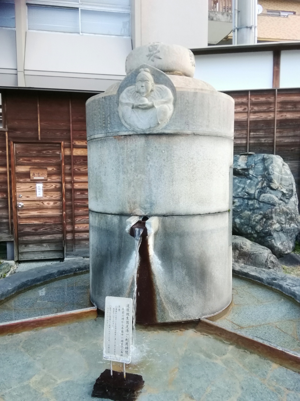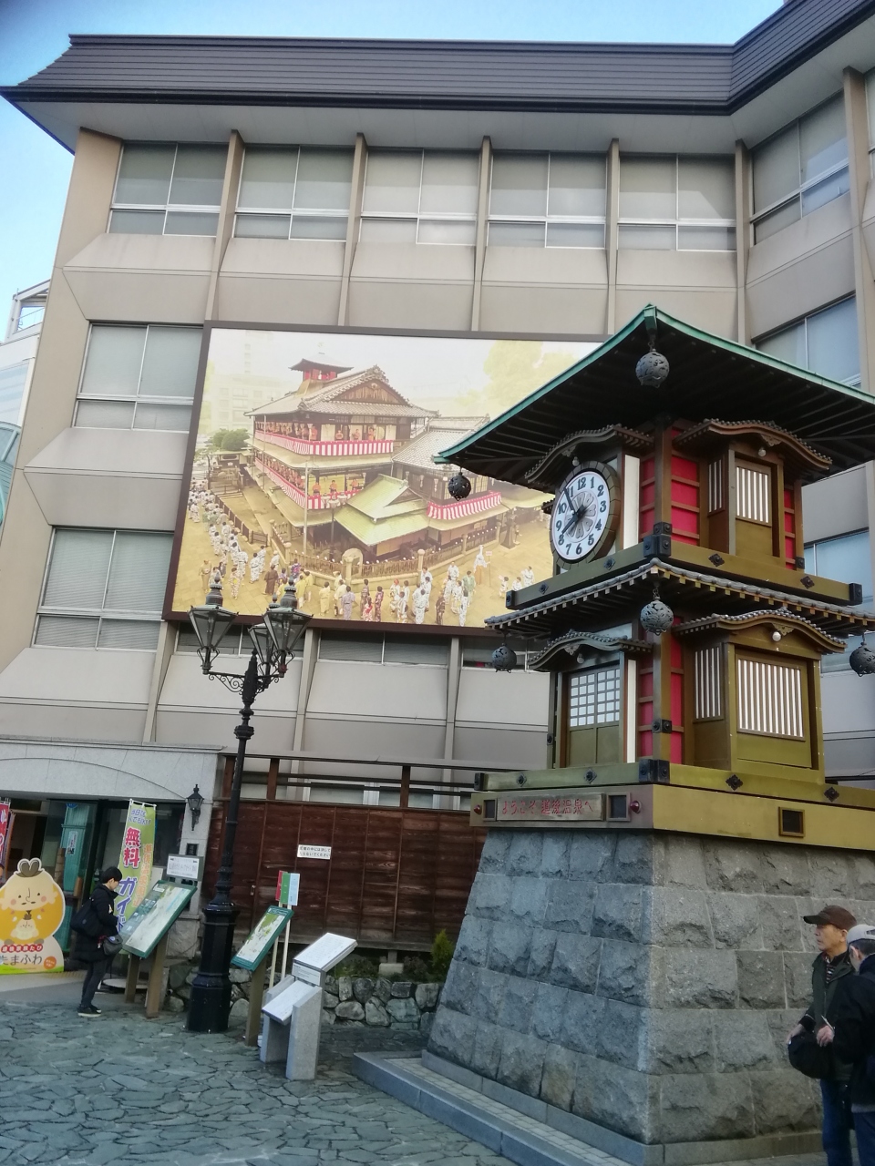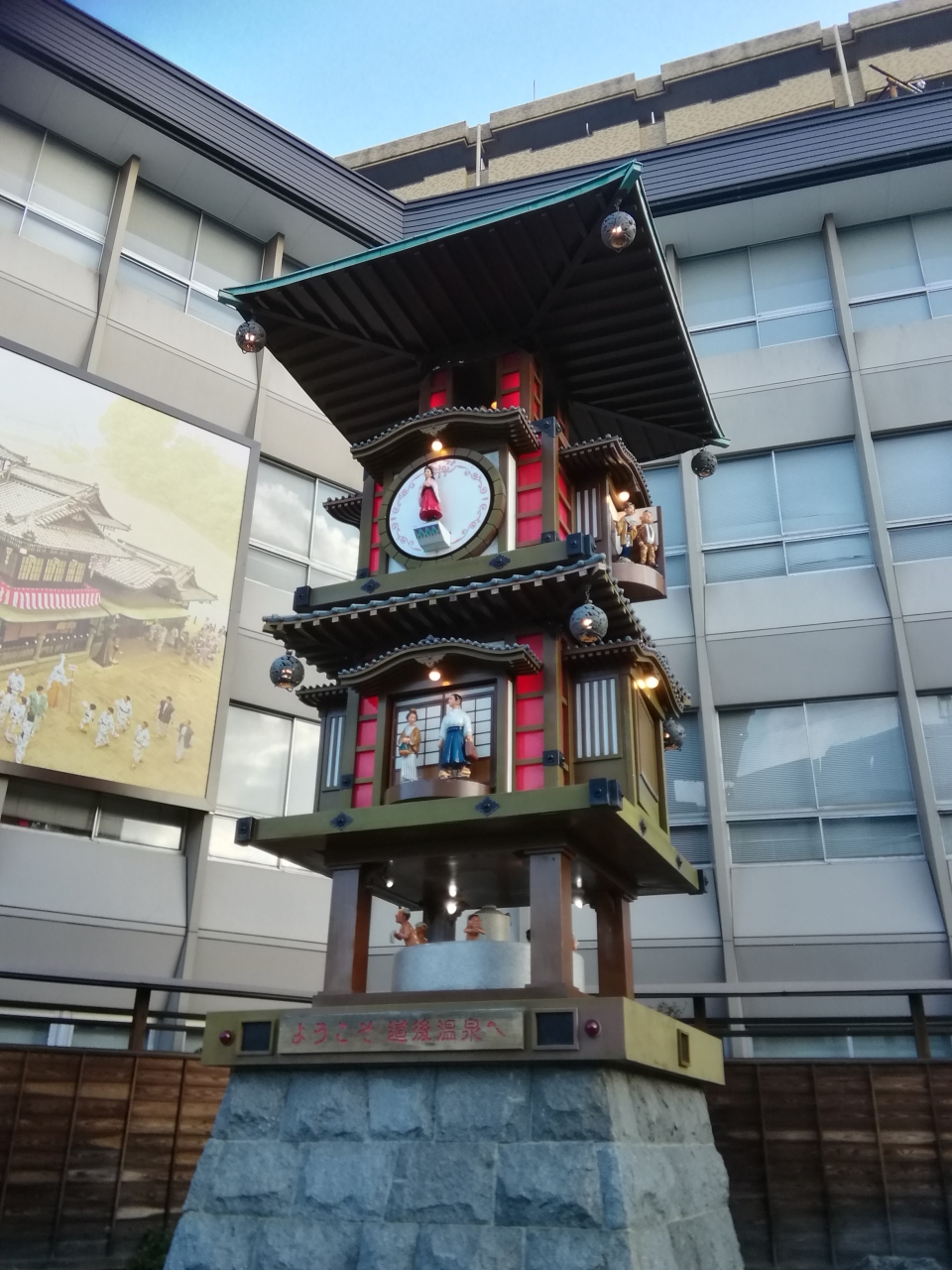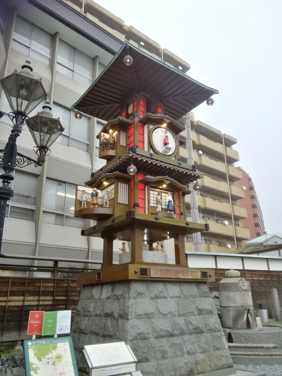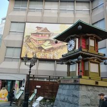 道後温泉駅を出るとアーケード街入口の横に立っているのが坊ちゃんカラクリ時計である。朝8時から夜10時まで1時間ごとに音楽とともにせり上がり、小説「坊っちゃん」の登場キャラクターが出てくれる。正面に現れるマドンアはカラクリ終了後、再び登場し道後温泉のアピールをしてくれます。隣には、道後温泉の源泉を使った「足湯」がありこれに入りながらカラクリ時計の仕掛けを眺めて過ごすという楽しみ方もありかなと思います。