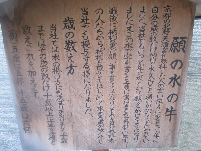 ここは、上野天満宮、山田天満宮と共に、名古屋の三大天神の一つに数えられていることからも想定される通り、主に学問の神様として、受験生等からの信仰が篤い神社です。よく天満宮には知恵を授かる撫で牛、的なのが見られると思いますが、ここでは、学業だけではないようですが、願掛けをしながら水をかけると願いが叶うという牛さんがいらして、いつしか、その水かけの際に使用する柄杓そのものを、御利益を求めて奉納するようになったそうです。勿論、別に絵馬掛けもありますが、柄杓を奉納するというのは、他にあまり例がないかなと思いますので、より大きな御利益を期待される方は、思い切って奉納されるのも良いかなと思います。