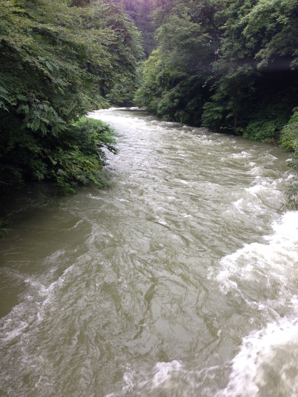 台風一過のすぐあとに鶴仙渓を訪問しました。遊んでいる子供たちもいましたが、水量が多く、波も荒くてやや危険を感じました。川床の料理屋さんも休館。湿気が多く、水はけが和憂いので、石畳の階段など滑りやすかった。面白い散策ルートだけど、晴れた日に来たい。