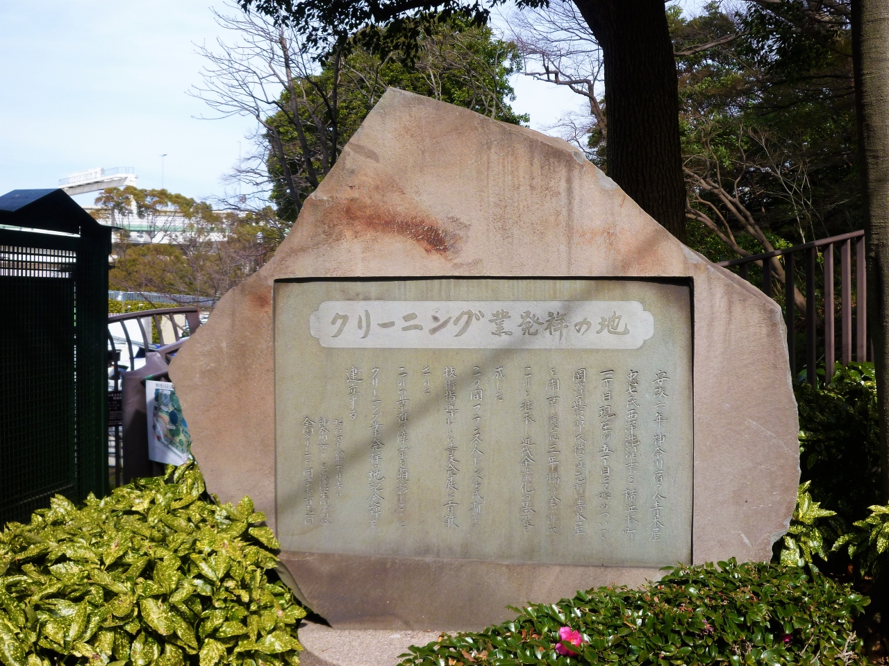 フランス山経由で港の見える丘公園へ散策したので帰り道に[谷戸坂]を下りました。旧道は片や公園/片やお屋敷でしたが、バルタール広場に近ずくと碑[クリーニング発祥の地]が。そこには、江戸末期に横浜で居留地の外国人を対象に(←やはり!)、クリーニング業を開業したと。