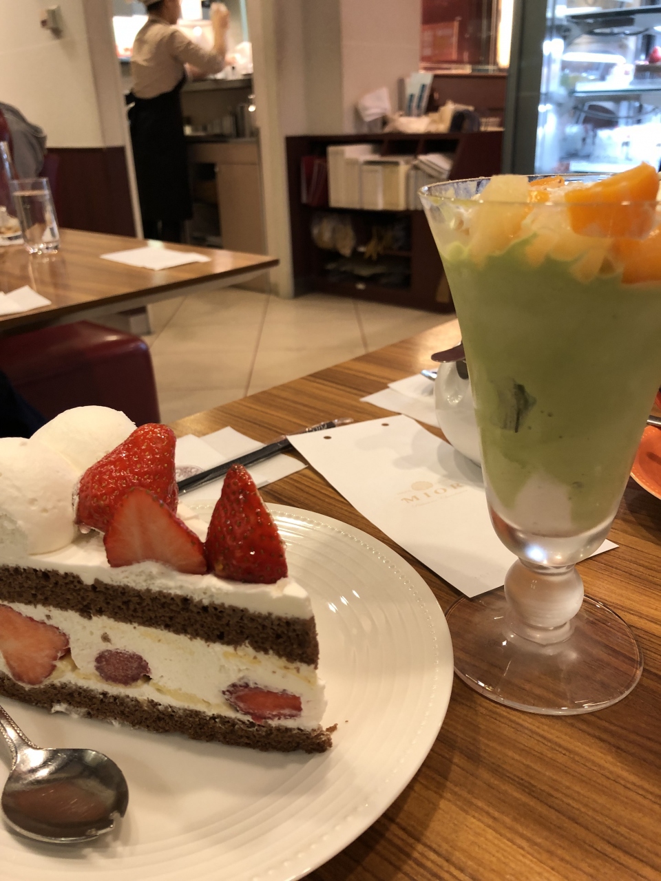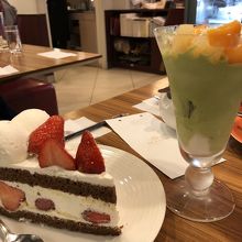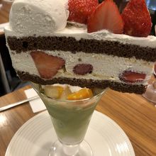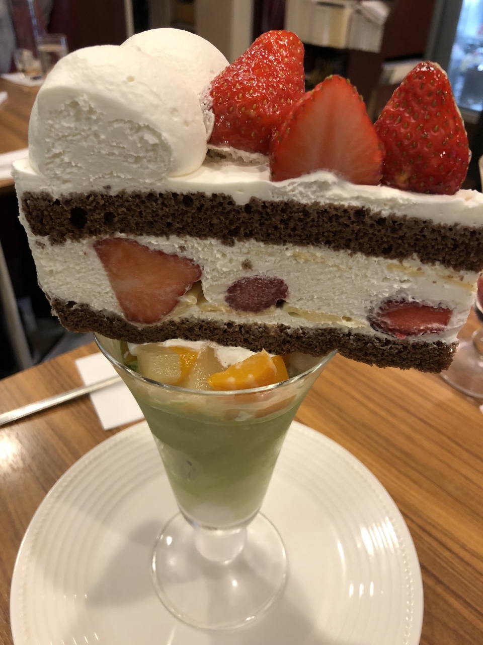 ベリーのパフェにモンブランケーキ、抹茶のパフェにチョコレートケーキなど、自分の好きなパフェとケーキを組み合わせて注文できるのがいいですね。で、抹茶パフェといちごのショートケーキNYカットを注文しました。ケーキはかなりの大きさですが、パフェの上にでん!とのっけて供されます。でも、お皿もいっしょにくれるので、実際にはケーキはお皿に移して食べました。おいしくてボリュームもたっぷりでした!
