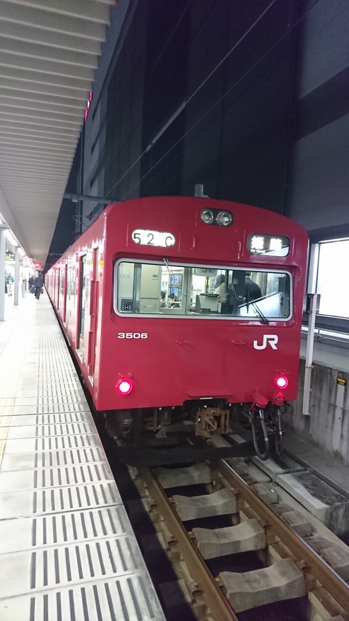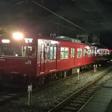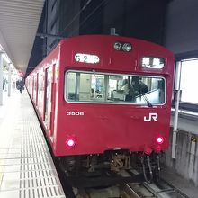 山陽本線の姫路から山陰本線の和田山までの65.7キロの全線単線の路線で、国道312号線が並走します。「播但」とは、播磨の国と但馬の国を結ぶという意味です。姫路~寺前間は電化されていますが、寺前~和田山間は明治時代に建造された古いトンネルが多く開口面積が小さいため、電化できず、寺前を境に運行系統が分かれています。このため、全線を直通するのは「特急はまかぜ」のみ。電化区間はワインレッドの103系が使用されており、ファンには懐かしい車両が走る路線でもあります。また、全線で扉横のボタンを押して開閉します。