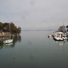 大津港から琵琶湖を眺めました。大津付近は琵琶湖が細長くなっている場所なので、両側の岸辺はわりとよく見えました。また大津は大きな町なのもあり、ビルなどの建物も結構多く建っているのがわかりました。訪れた日は寒い冬の日であったので、琵琶湖周辺にはあまり人は見かけませんでした。風がない日であったので、湖面は静かな感じでした。