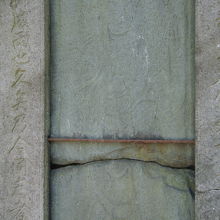 青い石に仏様の彫刻がなされているのを見ることができるが、かなりうっすらとしたものになっています。両側の白い石の柱が、説明書きにある江戸時代の人々が建てた側柱なのだと思います。東京都指定の有形文化財になっているようですが、このまま野外に置いておくと、彫刻がますます薄くなっていってしまうのではないでしょうか。