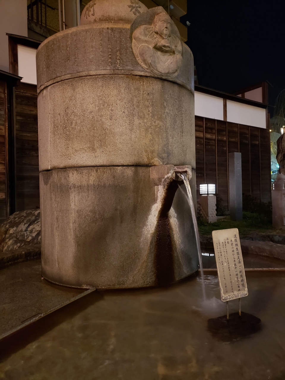 日本最古の温泉浴場として名高い道後温泉駅そばにある足湯スポット。足湯マニアとしては外せないスポット。お湯は高地ところから噴水さながら流れ落ちる仕組みなのでちょっとぬるいぞ!もう少し暑いほうがよろしい。観光客でいつもいっぱいなので場所取りも大変かも。
