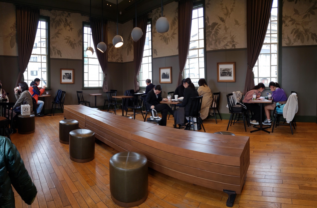 明治44年当初の洋風建築の旧駅舎を再現した建物に、スタバが併設されています。ちなみにこちらはリージョナル ランドマーク ストアと認定されています。リージョナル ランドマーク ストアとは、日本の各地域の象徴となる場所に建築デザインされ、地域の文化を世界に発信する店舗の総称だそう。吾輩は日本国内にあるリージョナルストアを全部廻ろうと、日夜旅行にいそしんでおります。こちらの店舗はあまり混雑しておらず、快適に過ごせました!