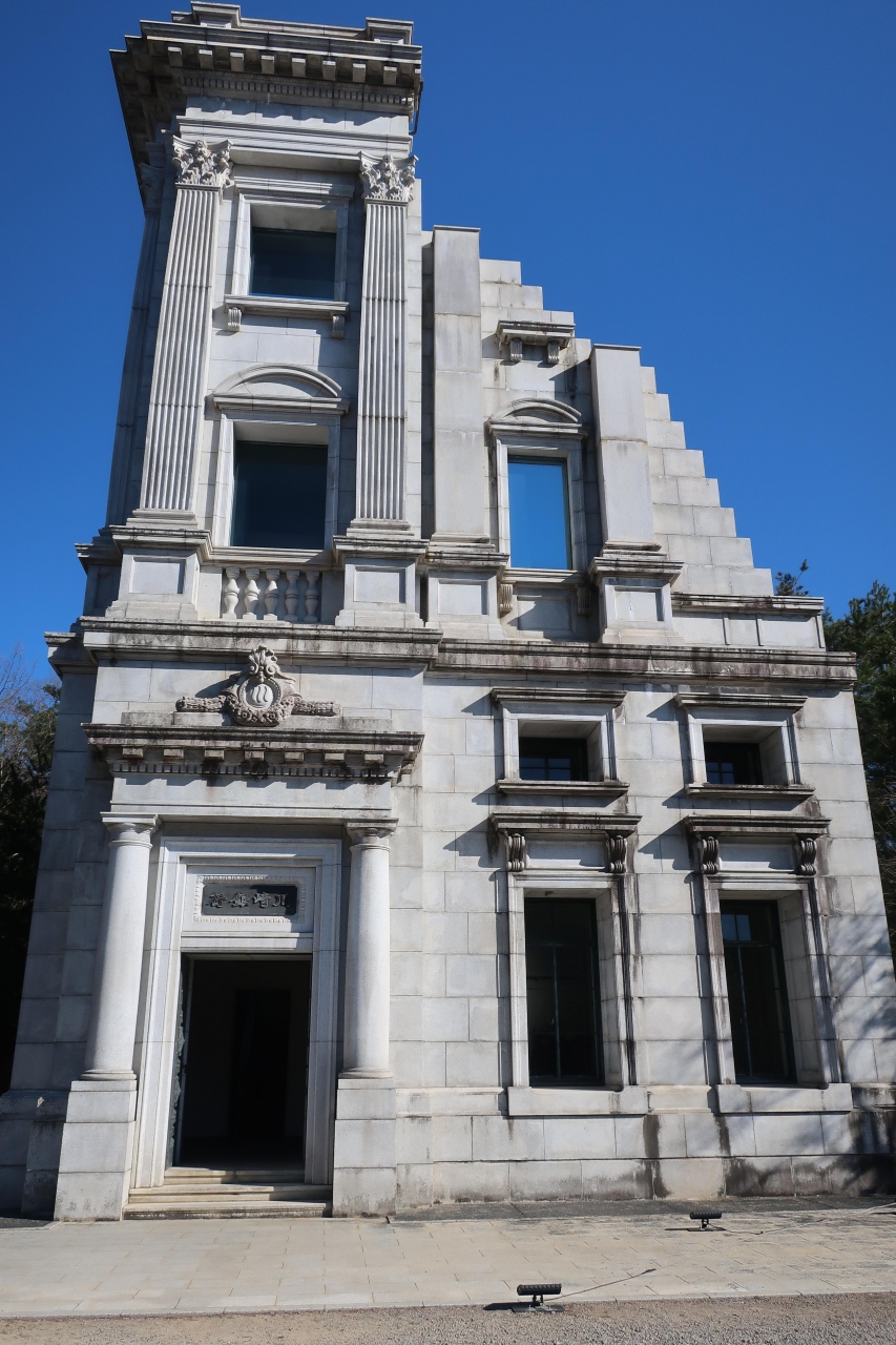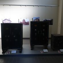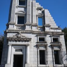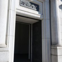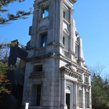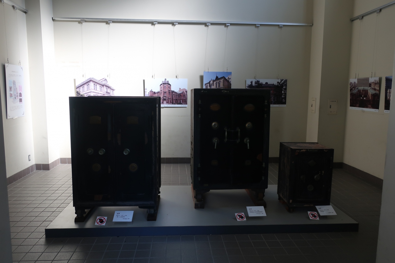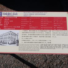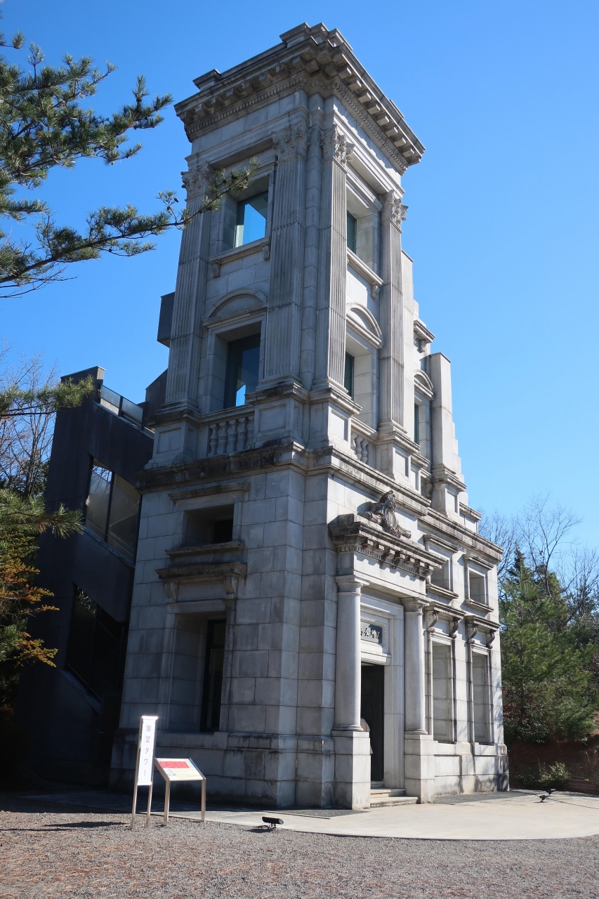 明治村5丁目の北部、内閣文庫の右手にある建物が川崎銀行本店です。日本橋にあった建物を移築したものですが、移築した部分は建物全体の左側角の一部のみ。それもほぼ外壁のみで中は一部しか残っていないのが残念。明治村にある建物ではこれほど少ない一部しか残っていない建物は珍しいのではないでしょうか。