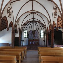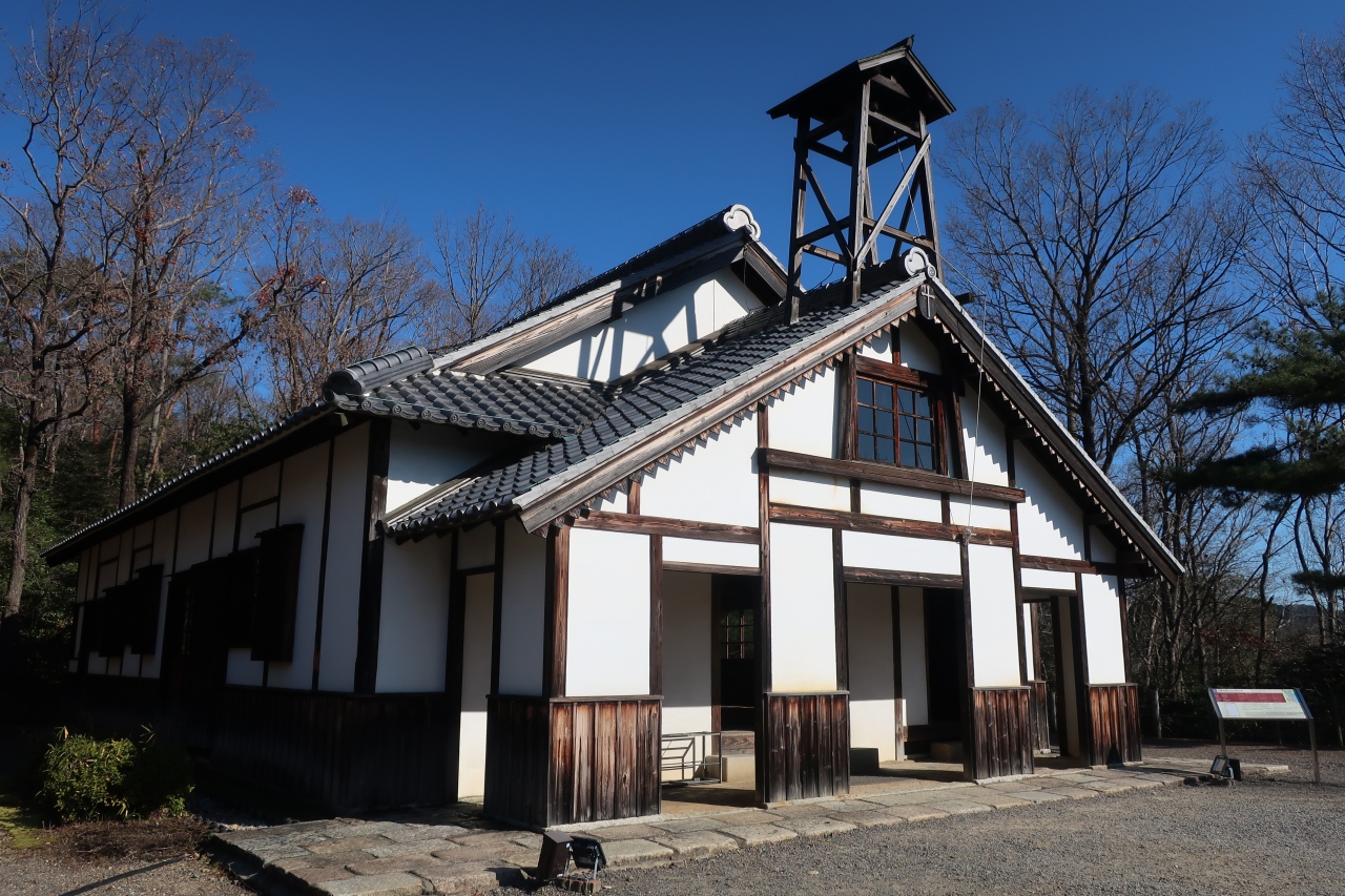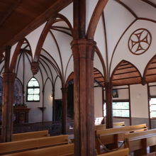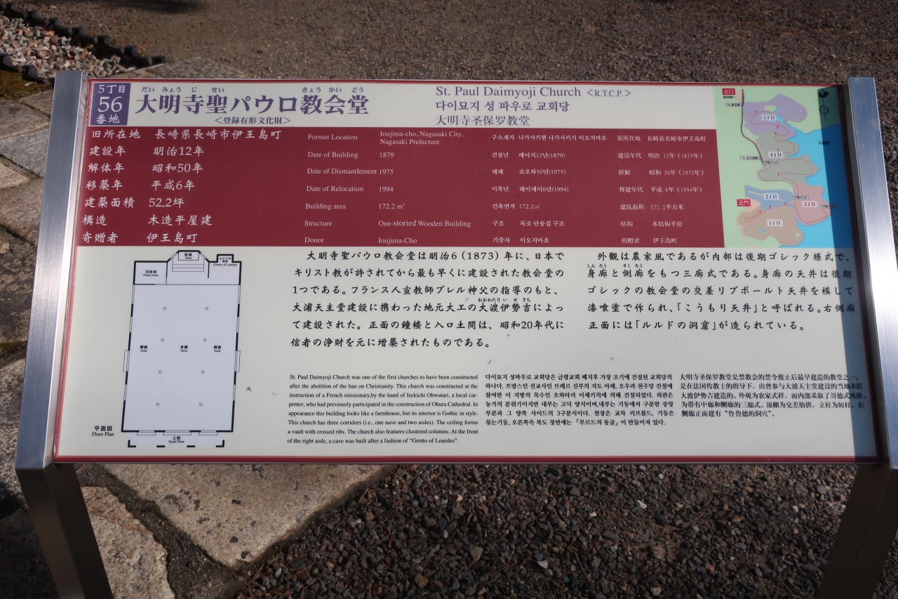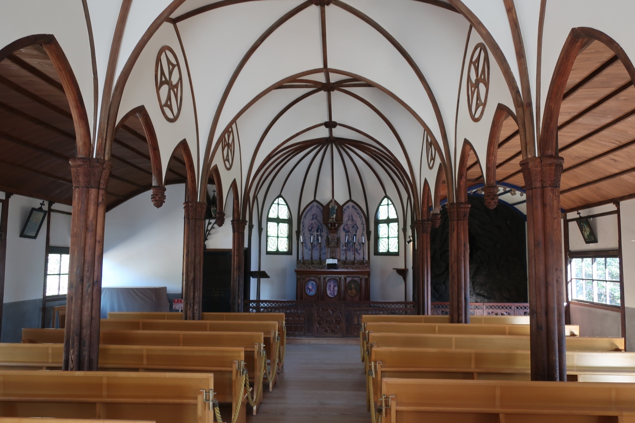 明治村5丁目の最北東部にあるのが大明寺聖パウロ教会堂です。明治12年に伊王島に建てられた教会建築を移築したものです。外観は瓦葺の純和風建築で一見、集会場の様に見えますが、中に入るとびっくり。内部はアーチがおりなす三廊式、奥には主祭壇があり、ステンドグラスがない以外海外の教会の様。外と中のギャップに驚かされます。