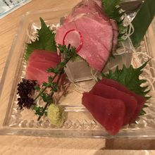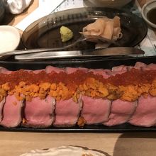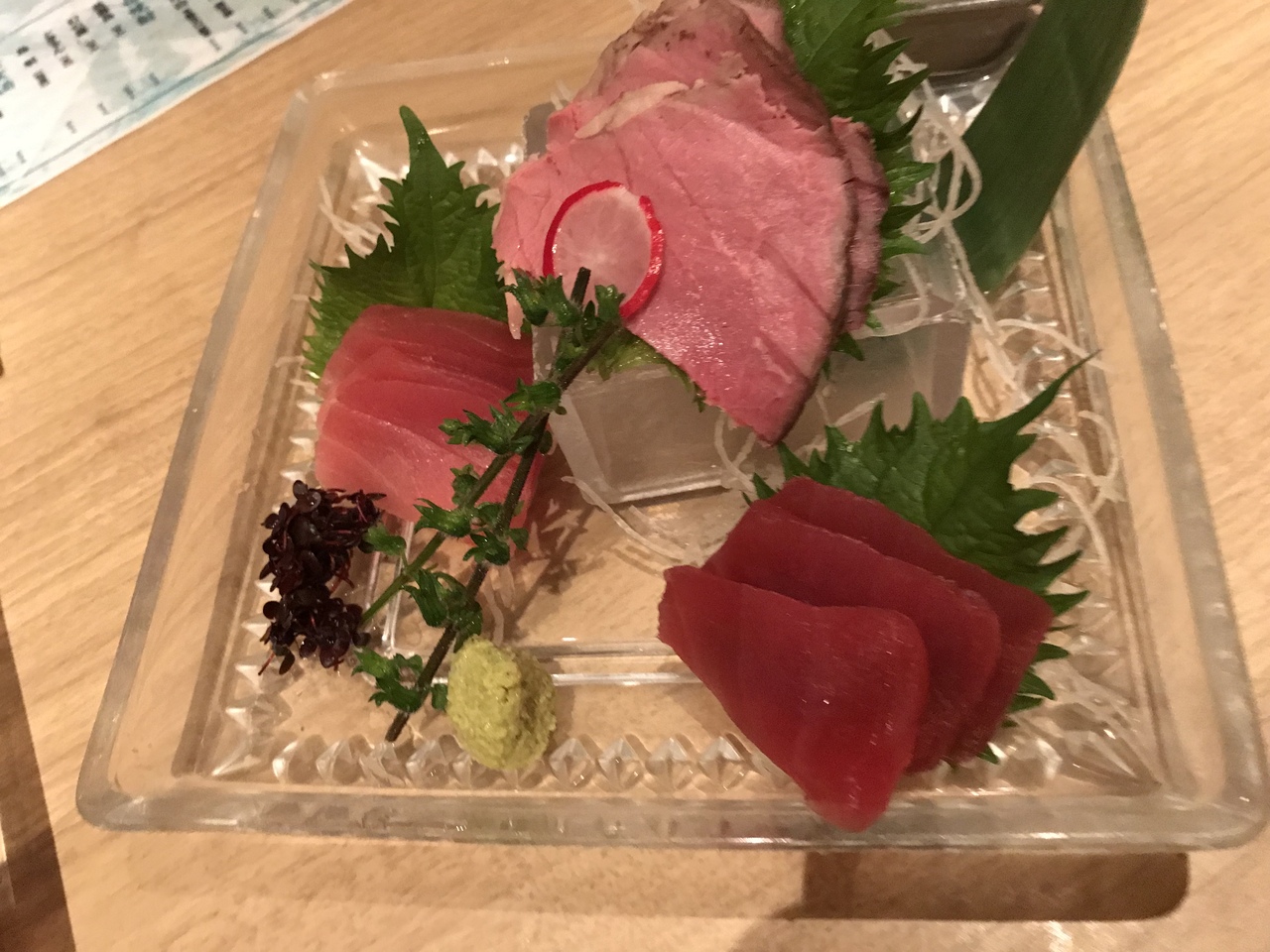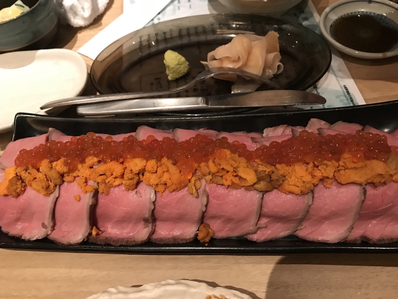 飲み放題のコース料理を注文。鮪の店だが鳥の唐揚げなと鮪以外のメニューも多く少し肩透かし。せっかくなので、オススメの肉ドレス巻きを注文。鮪の寿司の上にローストビーフが乗り、雲丹がトッピングされている。インスタ映えするメニューであるが、別々に食べた方が良いかな?