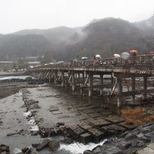 京都嵐山の観光の定番スポットの渡月橋です。雨の降る日の天候の悪い日でしたが、多くの観光客が訪れていました。傘をさしながら多くの人が渡月橋を歩いていました。渡月橋の下を流れる桂川の川底が浅くなっているのか、洪水の予防のためか川底の工事をしていました。