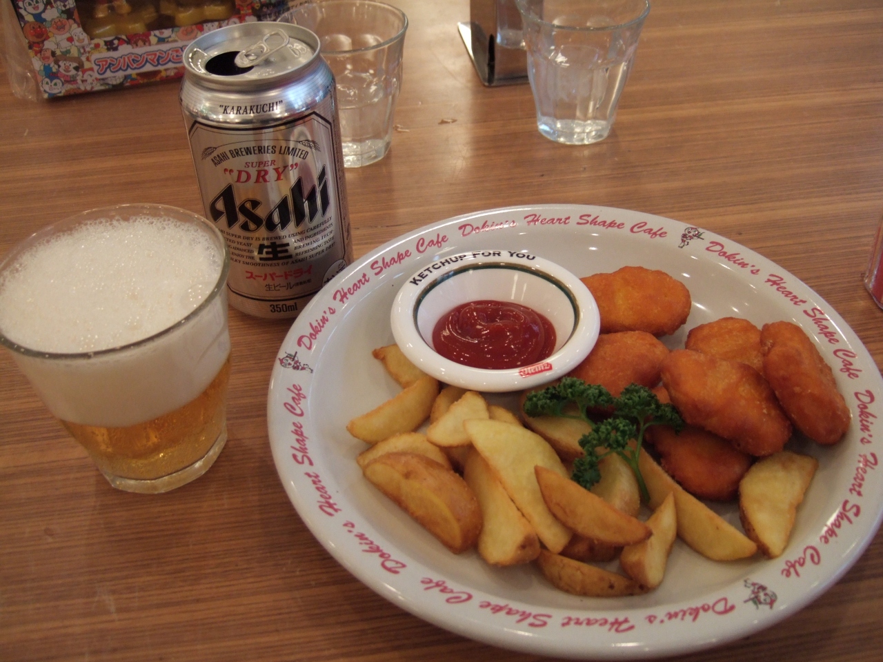 夕方になって娘がお腹が空いたと言うので入ってみました。娘はポテトにナゲット、私はチリバーガーにビールをオーダー。ビールは缶のスーパードライでした。